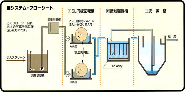 まず汚水は、微生物が付着しやすいサラン®繊維を円形状に形成、幾重にも重ね、汚水の中を効率良く回転させることで、汚水中の汚れを栄養分とするバクテリアで汚れを処理します。